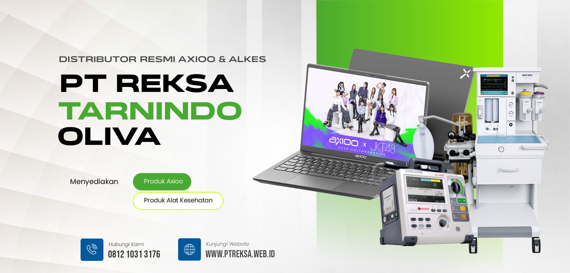 Sebagai distributor resmi Axioo, PT Reksa Tarnindo Oliva menyediakan berbagai produk laptop Axioo dengan jaminan keaslian serta garansi resmi. Selain itu, kami juga melayani pengadaan alat laboratorium dan alat kesehatan yang sesuai dengan standar kualitas dan kebutuhan industri.